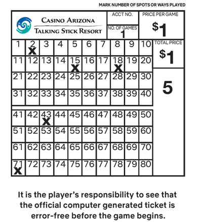 STEP 1:On a Keno ticket, mark your favorite numbers, amount of wager and number of games. Indicate the total numbers selected or “ways.”